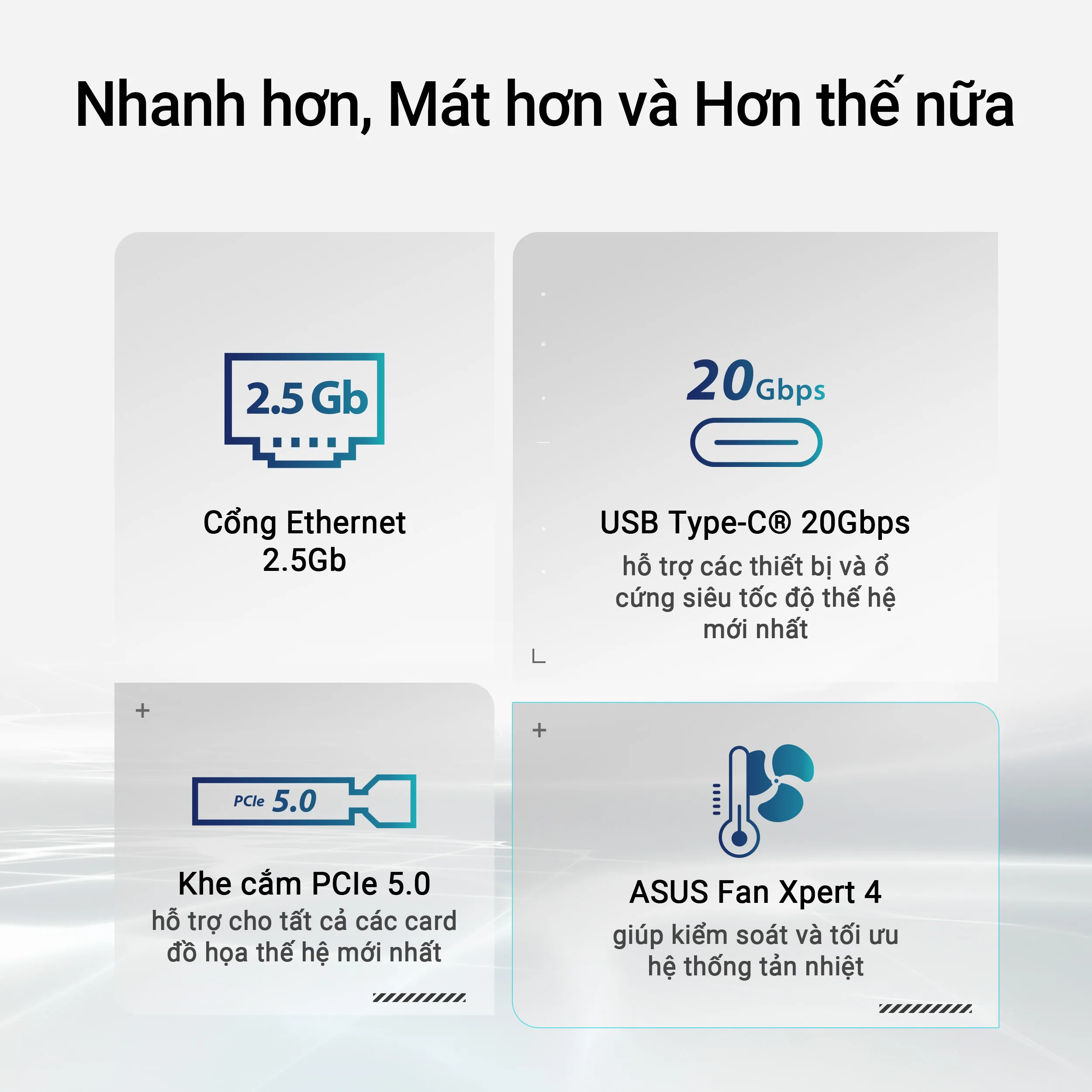 Cổng kết nối (Internal) Fan and Cooling related 1 x 4-pin CPU Fan header 1 x 4-pin CPU OPT Fan header 1 x 4-pin AIO Pump header 4 x 4-pin Chassis Fan headers Power related 1 x 24-pin Main Power connector 2 x 8-pin +12V CPU Power connector Storage related 4 x M.2 slots (Key M) 4 x SATA 6Gb/s ports USB 1 x USB 10Gbps connector (supports USB Type-C) 2 x USB 5Gbps headers support 4 additional USB 5Gbps ports 2 x USB 2.0 headers support 4 additional USB 2.0 ports Miscellaneous 3 x Addressable Gen2 headers 1 x Aura RGB header 1 x Clear CMOS header 1 x COM Port header 1 x Front Panel Audio header (F_AUDIO) 1 x S/PDIF Out header 1 x SPI TPM header (14-1pin) 1 x 10-1 pin Front System Panel header 1 x Thunderbolt (USB4) header