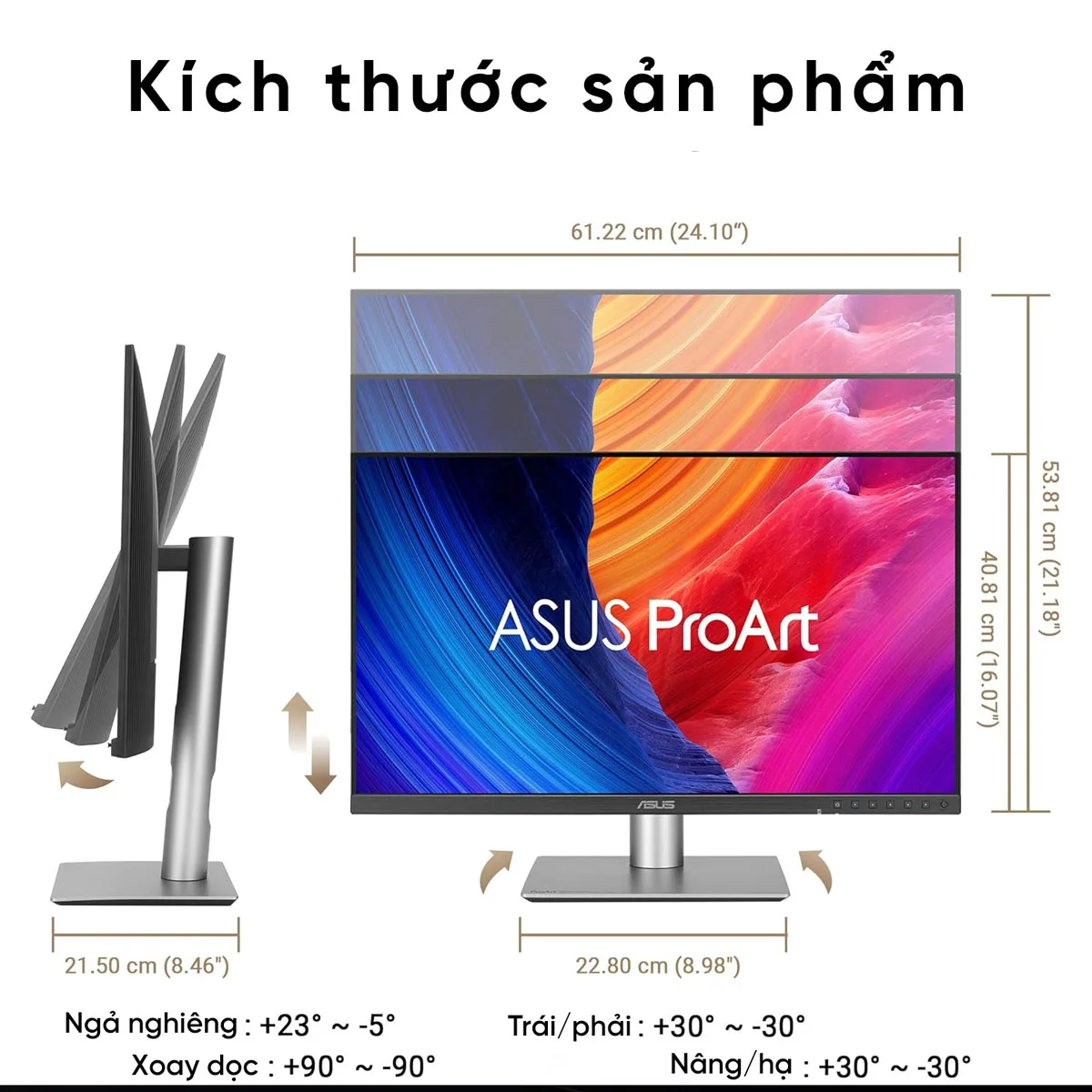 Màn hình đồ họa chuyên nghiệp ASUS không chỉ mạnh mẽ về hiệu năng mà còn sở hữu thiết kế công thái học thông minh. Chân đế cho phép tùy chỉnh linh hoạt độ cao, góc nghiêng, xoay ngang và thậm chí xoay dọc 90 độ, giúp bạn dễ dàng tìm được tư thế làm việc thoải mái nhất trong nhiều giờ liền.