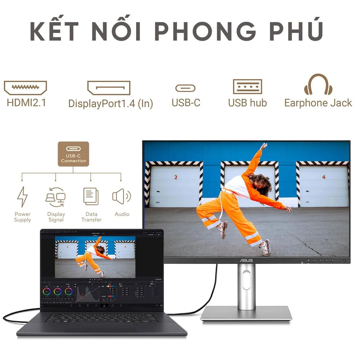Sự linh hoạt là yếu tố then chốt trong một không gian làm việc chuyên nghiệp. Màn hình này được trang bị cổng USB-C hỗ trợ sạc ngược lên đến 96W, cho phép bạn vừa truyền tín hiệu hình ảnh chất lượng cao, vừa sạc pin cho laptop (đặc biệt là MacBook) chỉ qua một sợi cáp duy nhất. Bên cạnh đó, các cổng HDMI 2.1, DisplayPort 1.4 và hub USB 3.2 mở ra khả năng kết nối không giới hạn với mọi thiết bị ngoại vi cần thiết.