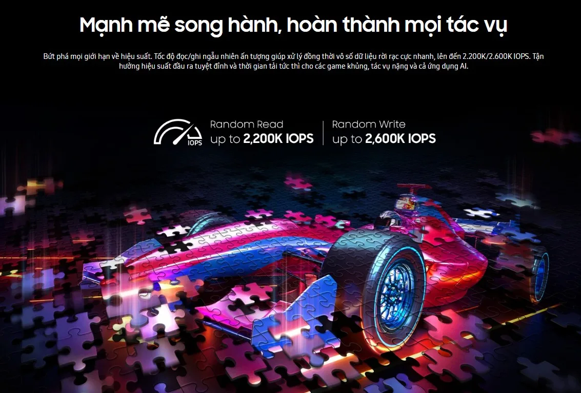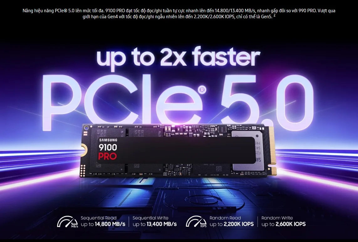 SSD Samsung 9100 Pro Gen 5.0 x4 NVMe MZ-VAP4T0BW sở hữu tốc độ đọc lên đến 14.800MB/s và ghi 13.400MB/s, chuẩn giao tiếp NVMe™ 2.0 hiện đại, tối ưu cho gaming, sáng tạo nội dung và xử lý công việc chuyên sâu